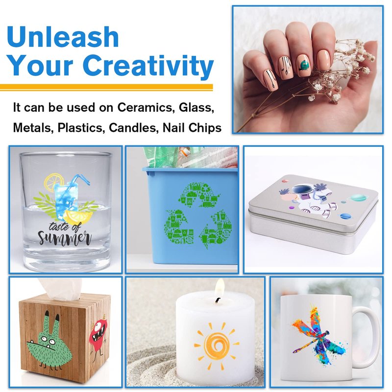 - Best idea for crafting projects. Print, cut, then transfer any designs you like to mugs, tumblers, plates, candles, nail-art chips, vase, water bottles and much more