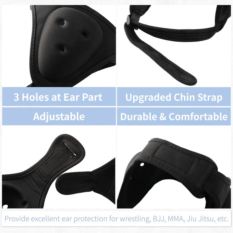 - Ergonomic Design & Adjustable - The headguard for BJJ with 3D ergonomic shape will provide maxmium comfort for you. Small holes in ear part ensure better hearing. Adjustable chin strap ensures proper fit.