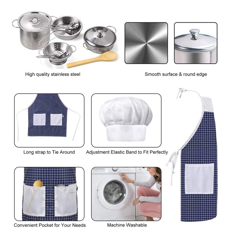- š„¦ćPLAY KITCHEN ACCESSORIES ć: Includes a Total of 24 Pieces: a Colander, Stainless Steel Play Pots and Pans with Lid and Handles, 4 Stainless Steel and Wooden Utensils, Apron & Chef Hat, Pot Holder, and Cutting Vegetable Toys.