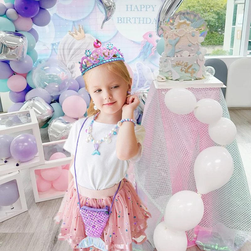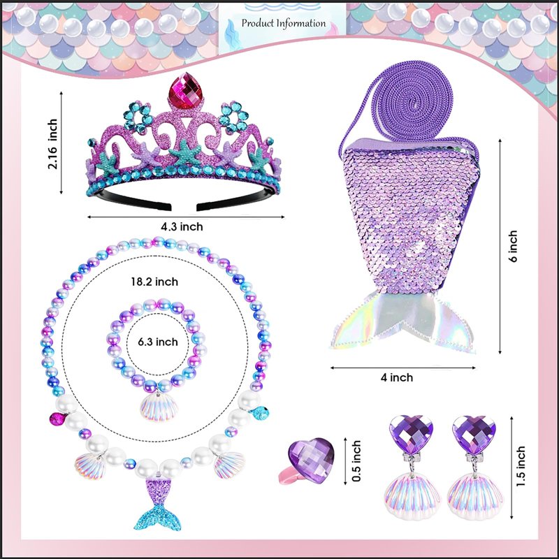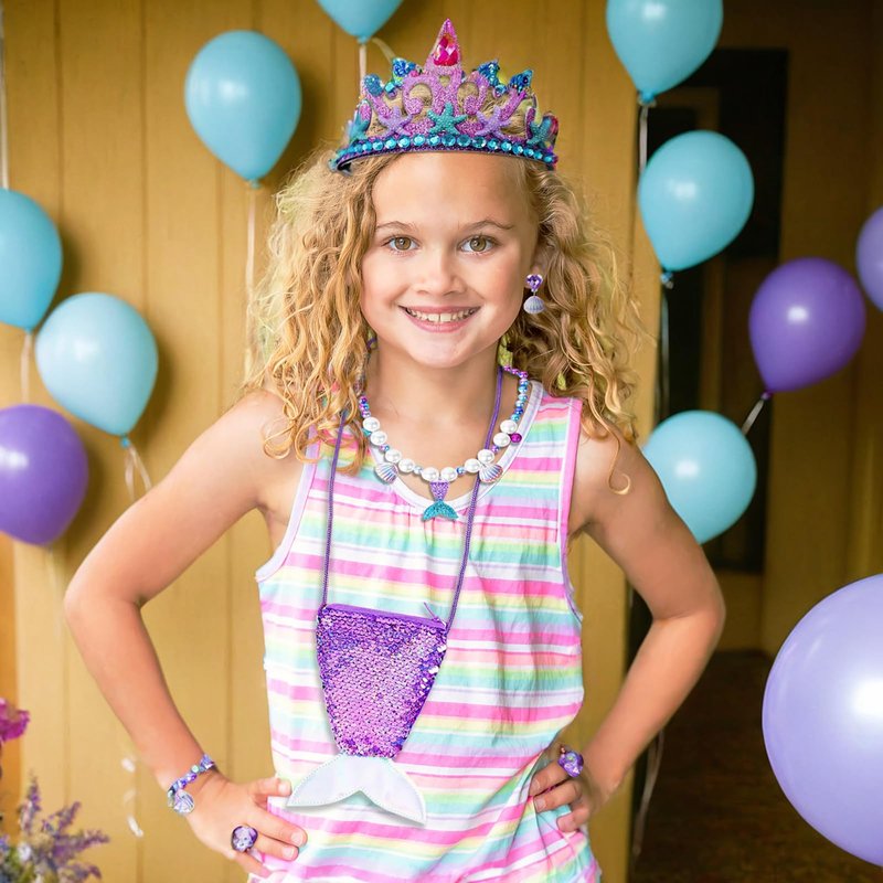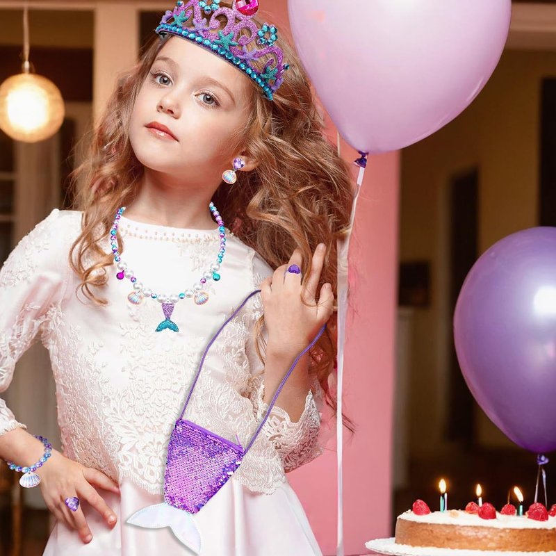 • Cute design: mermaid jewelry set features a combination of blue and purple and white fake pearls with a mermaid tail, shell, and bell pendant. The bracelet and necklace have elastic for adjustable wear. The purple purse features a mermaid tail design with shiny scales on one side. The mermaid headband is removable and the fake diamond shell earrings are an ear clip design. The perfect princess dress up to fulfill a little girl's dream
