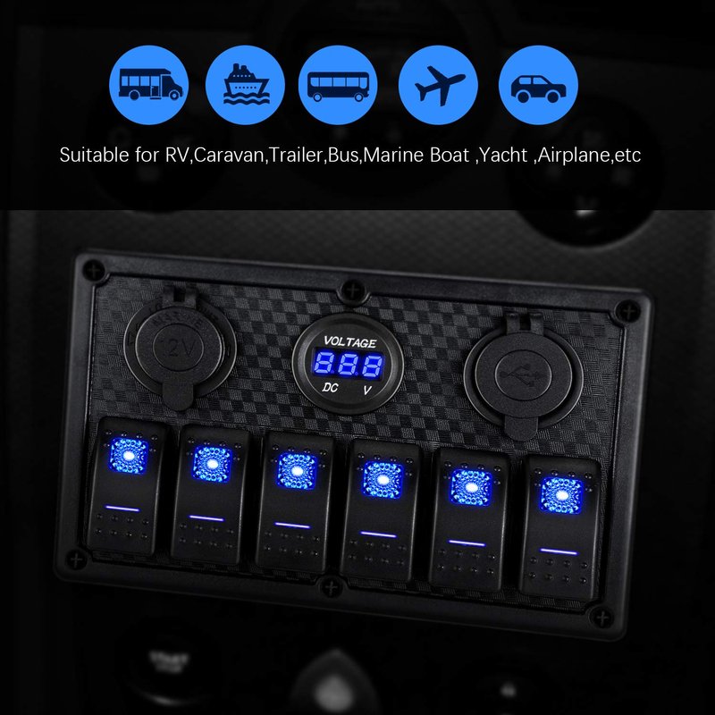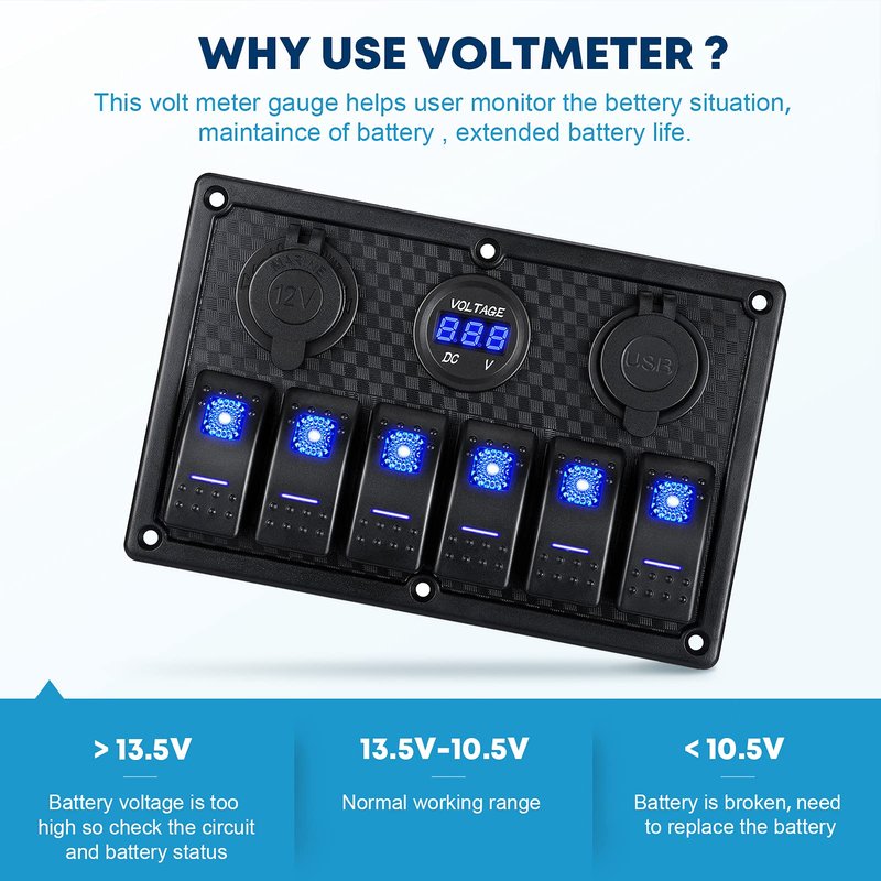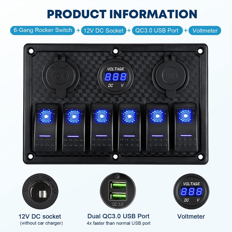 - 【Multifunction】: This 12V/24V electrical panel contains digital voltage display, blue LED light indicator, waterproof board, 12V charger socket and double 18W 3.0A QC3.0 USB charging sockets to meet your various needs like charging.