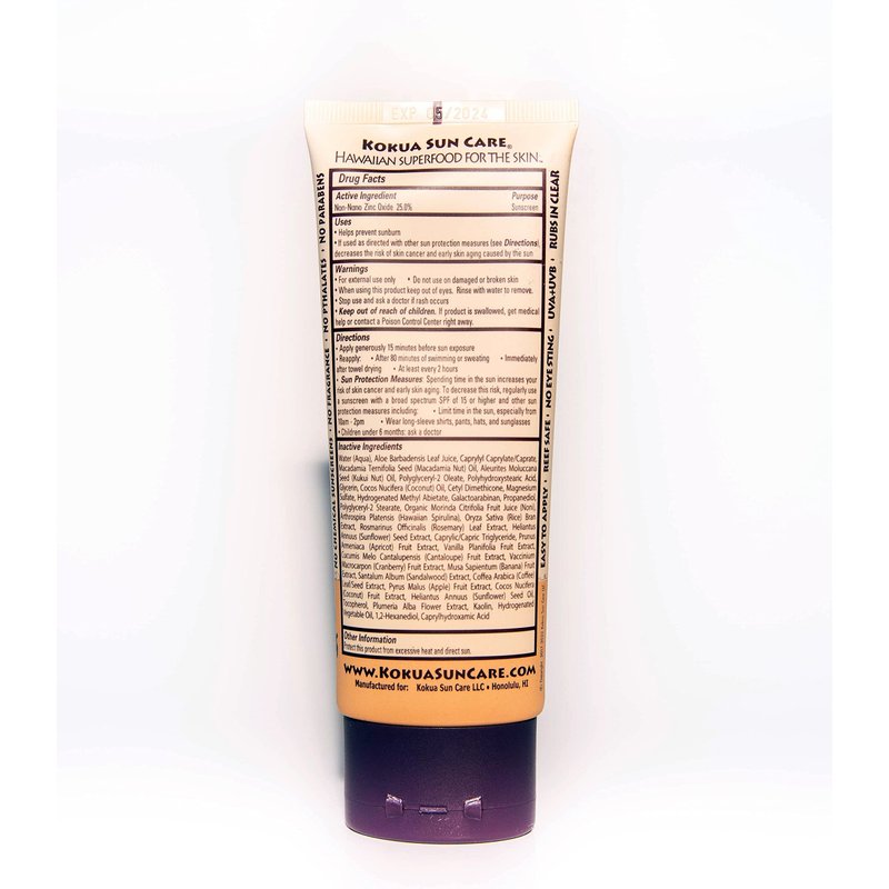 Kokua Sun Care Hawaiian Natural Zinc Sunscreen 50 SPF 80 Min Water Resistance is a luxury high performance sunscreen with broad spectrum protection using Zinc Oxide to provide a natural physical barrier to the suns UVA and UVB rays while deeply nourishing the skin with nutrient dense antioxidant Hawaii-grown botanicals. Extract, Noni, Hawaiian Spirulina, Plumeria Extract, Honey, Macadamia Nut Oil and Kukui Nut Oil. Professionally formulated and manufactured for superior quality, this sunscreen goes on clear and smooth and will kokua you from the mountains to the oceans and everywhere in between without harming the environment. HAWAIIAN SUPERFOOD FOR YOUR SKIN, 25% Non-nano Zinc Oxide, UVA/UVB Broad Spectrum Protection, Reef safe, no oxybenzone or any other chemical sunscreens, Nourishes, hydrates and protects with 7 antioxidant rich Hawaii grown botanicals, No harsh preservatives or artificial fragrances, Paraben and phthalate free, Light, natural coconut-vanilla scent naturally derived from plant extracts, Supports local Hawaii business, agriculture and non-profit organizations