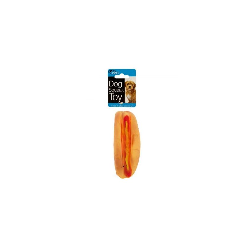 - Fun design features a Squeaky, colored hot dog with raised texture and painted details