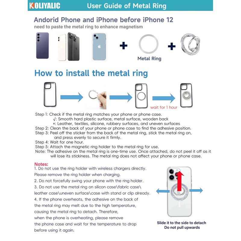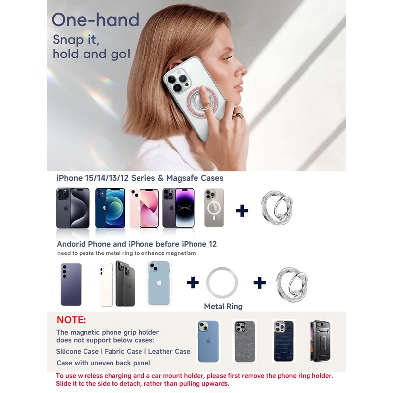 - 【Friendly Reminder】 ①This magnetic ring is designed for one-sided use. Please remember to remove the ring before using wireless charging or attaching it to a car mount. Adding an extra metal ring will not interfere with wireless charging. ②The additional metal ring is meant to boost magnetism. For added security, consider adding it first. ③The metal ring should be attached to a firm, flat surface on the phone or phone case. It is not suitable for soft rubber cases (TPU/PP/TPE/Silicone),leather and fabric case or surfaces coated with elastic paint or other specialized coatings that are difficult to adhere to.