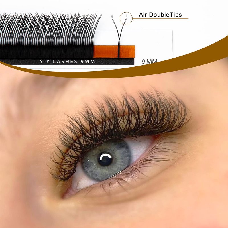 - What are YY Lashes:The base of 4 lash extensions is bonded together and splits into two lash extension, forming a Y shape eyelash extension. Kolybel YY premade fans have 0.05/0.07 thickness, C/D Curl ,10-15 single length tray and 8-15mm mixed tray, 12rows/tray.