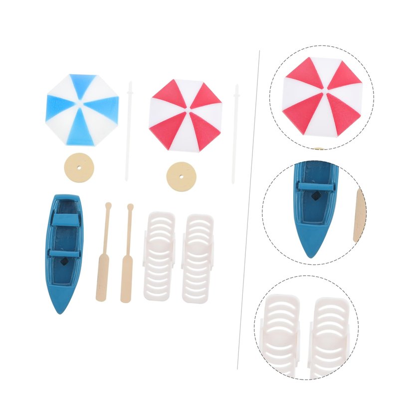 2 x mini beach umbrella 2 x mini beach chair 1 x mini boat 2 x mini pulp