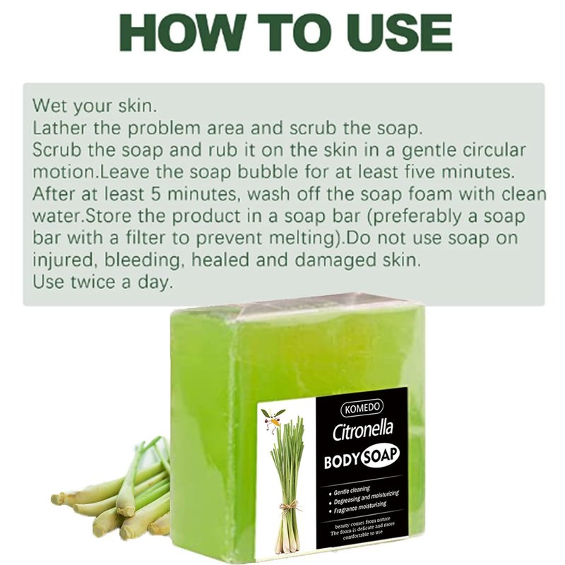 - Citronella Soap Bar: Contains citronella essence, a touch of citronella fragrance, mild ingredients, can be used for cleansing, bathing and shampooing, gentle cleansing, easy to remove dirt, degreasing, hydrating and moisturizing.