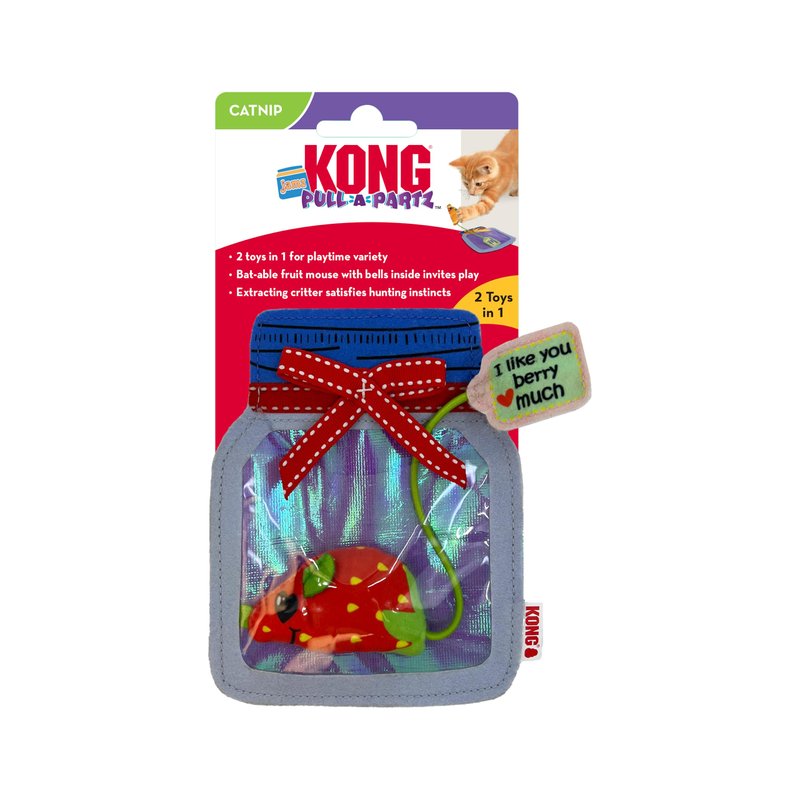 KONG Pull-a-Partz Jamz’ fruity mouse tempts curious kitties to pry him out for batting and pouncing fun—with springy elastic tail to add excitement to pantry playtime. Two toys in one provide dismantling action that satisfies hunting instincts. Crackly film extends engagement while KONG Premium North American Catnip in mouse heightens enjoyment.