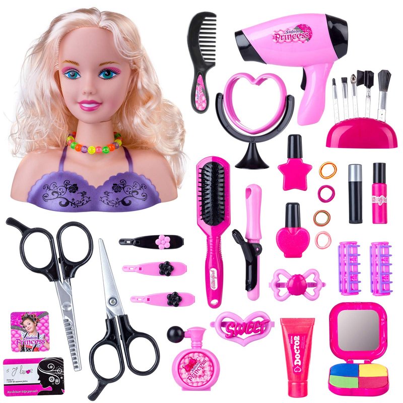 • Set Including-Doll with hair, make up set and accessories, such as the comb, hair dryer, mirrors, makeup brushes, lipstick and and more as the image displayed.