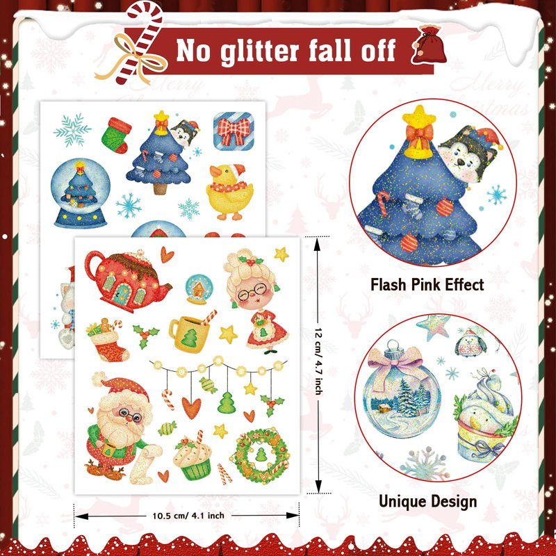 - Glitter Christmas Temporary Tattoo Stickers: Set includes 8 sheets (145+ pieces) of super glittery Christmas tattoo. Suitable as a small gift for children's Christmas party, or as one of the gifts to fill Christmas stockings. In addition, these cute fake tattoos can be gifts for Christmas and New Year season to add festive atmosphere