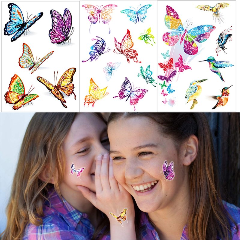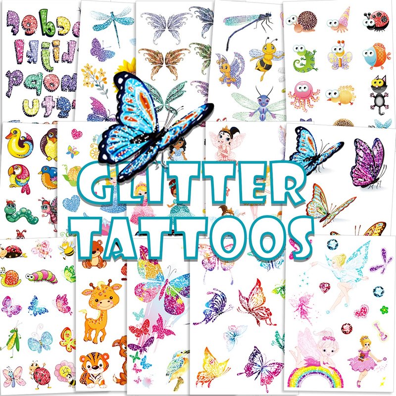 - 【Children's Party Decor Gift & Goodie Bags Filler】 High quality Glitter Temporary Tattoos are the perfect girls boys kids costume accessories, party favors supplies. Suitable for children's birthday parties, flower fairy party, theme party, zoo animal parties, butterfly-themed parties, Jungle woodland animal, children's day party gifts, Halloween Christmas party bag fillers, girl parties, stage performances, school carnival parties, class rewards etc.