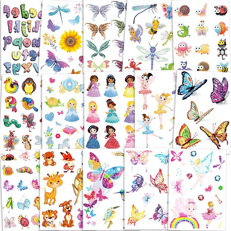 • 【Glitter Flash Temporary Tattoos for Kids】15sheets(180+pcs) Kids Glitter fake tattoos kit with different patterns, includes flower fairy, Princess, butterfly, bee,deer,dog,fox,tiger,Cattle,Chicken,duck, peacock, dragonfly, horse, diamond, carriage, snails, letter etc. Rich flashing cartoon patterns, the fun glittery designs.