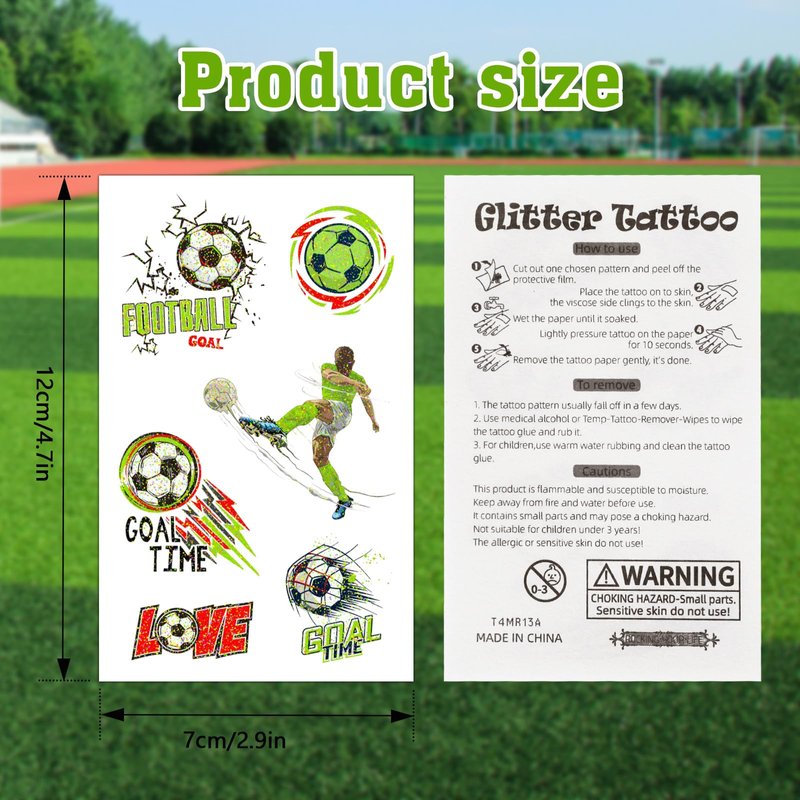 - 【 Safe and friendly material 】 We use environmentally friendly and non-toxic material to make the sports tattoos for kids, suitable for children over 3 years old, so you can rest assured. The water-resistant design ensures that kids will enjoy showing off their tattoos during play, long-lasting and durable. Everyone can have glitter soccer ball tattoo stickers.