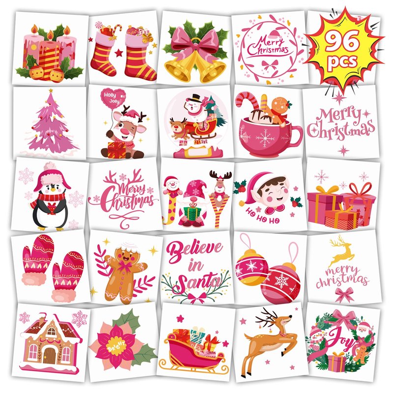 - Package Include: This pink christmas decorations tattoos set includes 48 different designs, for a total of 96pcs pink christmas tattoos. Individually wrapped, easy to apply and make it easy for both adult and kids. Idea for any christmas occasions, these tattoos are great for christmas goodie bag fillers, christmas party favors