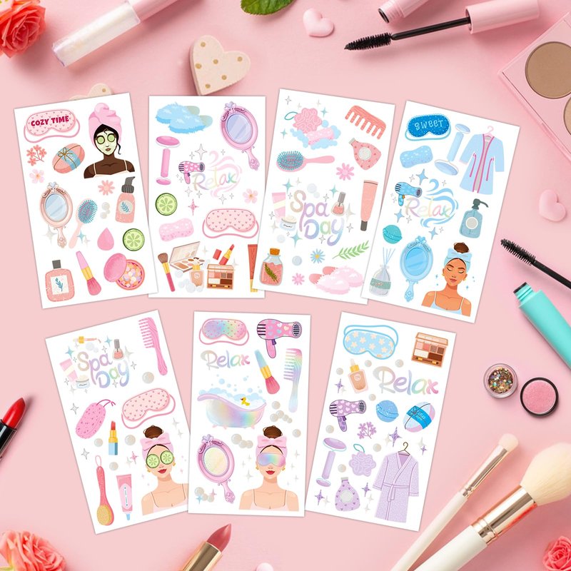 - 【 Package Includes 】 10 sheets colorful spa tattoos for girls with 99+ style beautiful patterns. Decorate yourself and have fun, these patterns include robes, eye masks, slippers, cucumbers, cosmetics and more.