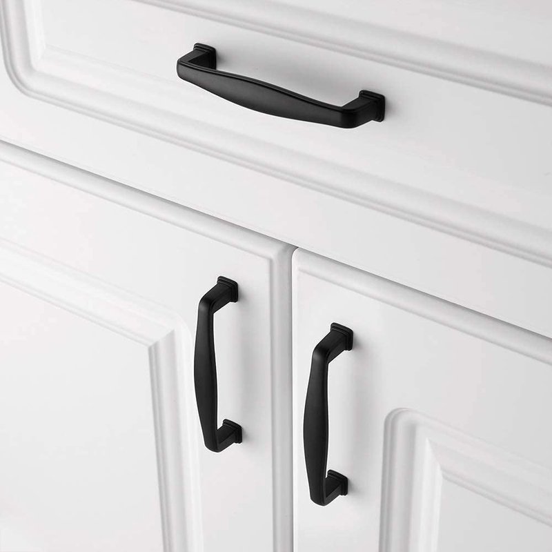 - Pack of 10 black square foot arch cabinet pull handles, solid metal hardware.