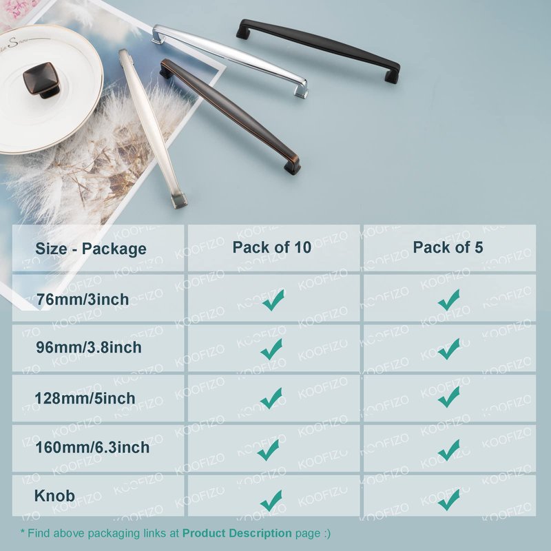 Important Info: * Screwhole distance: 5" inch/128mm; * Overall length: 5.51 inch/140mm; * Height: 26mm/1 inch; * Screw sizes: 8-32X25mm & 8-32X38mm; Included screws are most suitable for board thickness of common cabinet door and drawer front, special screws need to be prepared separately. * Finish: Oil Rubbed Bronze; * Each square foot arch pull handle is individually polybagged, 10 handles are packed in 1 box as a unit; * Solid zinc material+high quality finishing; * Comfortable and durable at high-traffic application; * An ideal hardware product for kitchen cupboard, cabinet door / drawer, bedroom dresser and all rooms ; Get Koofizo Hardware=Get Good Value! Any question or problem about the goods, please don't hesitate to contact us. We will do our best for buyers' satisfaction!