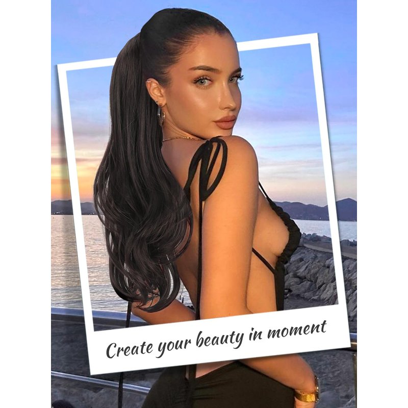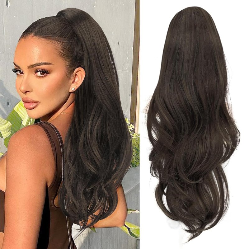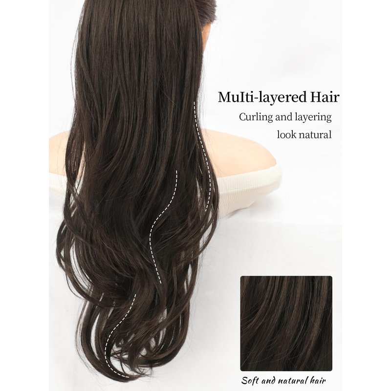 KooKaStyle Ponytail Extensions, 22 inch Dark Brown Long Drawstring Wavy Clip in Ponytail Hair Extensions Layered Synthetic Hairpiece for Women