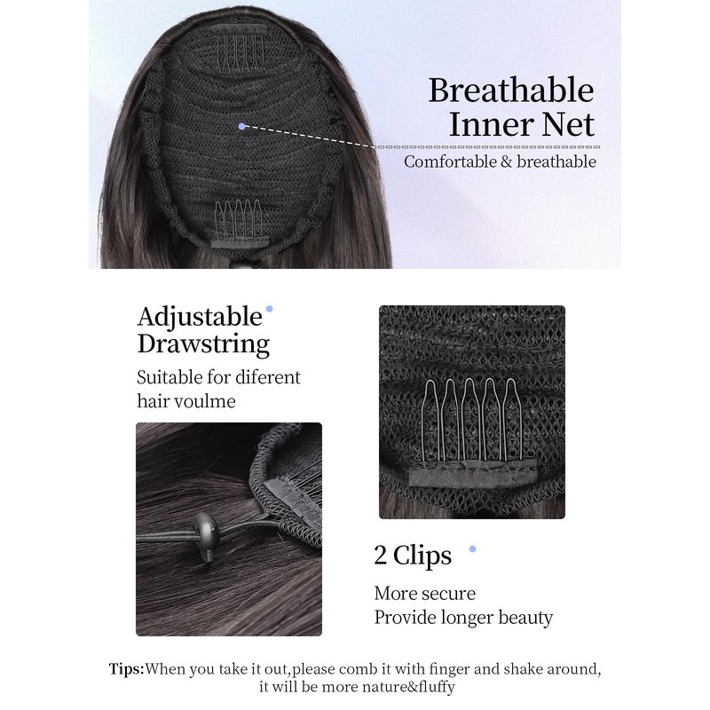 • [Stays in Place] Drawstring ponytail protects you from awkward situations. It features four invisible combs and a high-elastic drawstring construction to keep the ponytail extension in place all day long.