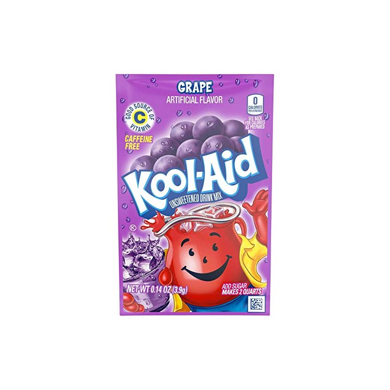 Kool-Aid Artificially Flavored Grape Unsweetened Powdered Drink Mix is a delicious way to stay hydrated. This unsweetened powdered drink mix makes it easy to prepare a tasty purple grape drink. Just mix it with water and sugar or your sweetener of choice. Quench your thirst with the refreshingly sweet taste of grape. With no caffeine, this artificially flavored grape powdered drink mix is always a great choice for the whole family. It's also a good source of vitamin C. These handy packets of unsweetened grape drink ensure that you always have a refreshing beverage ready-to-go. To prepare, empty contents of the 0.14 ounce drink mix packet into a plastic or glass pitcher. Add 1 cup of sugar or sweetener. Then, just add ice and water and stir for a 2 quart supply of tasty grape Kool-Aid.