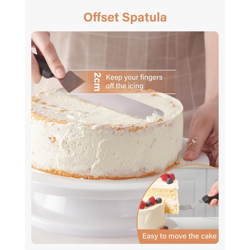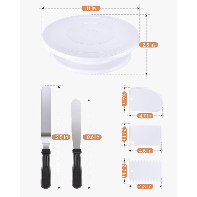 - Essential Cake Decorating Supplies Kit: This baking supplies has everything you need to create beautiful cakes, including 2 frosting spatulas, 3 scrapers, and an easy-to-use cake turntable. No need to buy extra products — all you need is the frosting, the cake, and this cake decorating kit!
