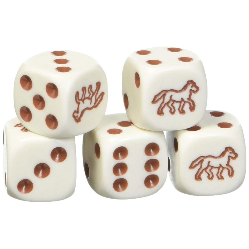 - Comes with five brown or black dice with a horse in place of the 1.