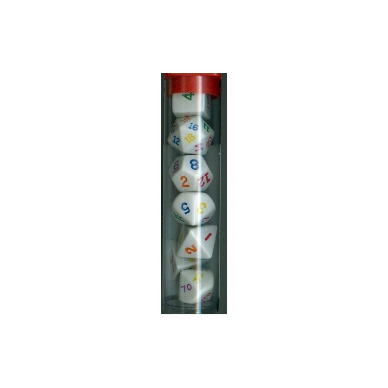 Set of 7 Polyhedral Dice. Dice are white with colorful numbers. Includes 4, 6, 8, 10, 10 (tens), 12, and 20 sided dice.