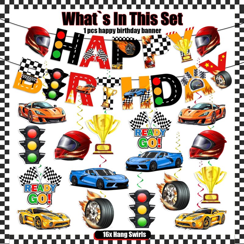 - 【Package Included】:Race car birthday decorations includes 1pcs happy birthday banner and 16pcs race car themed card swirls with 8 different styles(traffic light, champion, helmet, tires, racing cars, READY GO sign).
