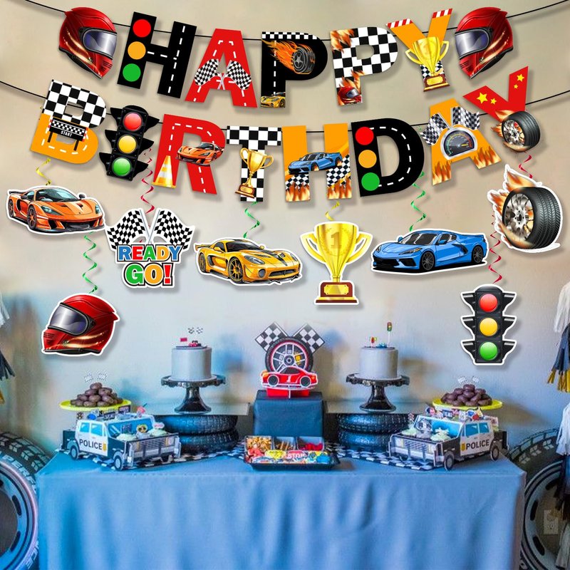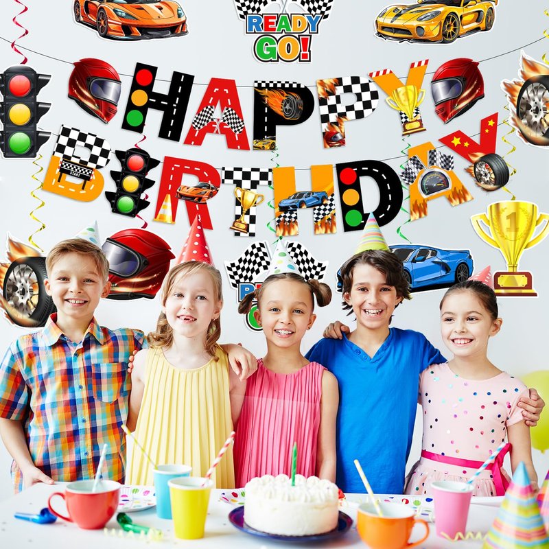 KORHONEN Race Car Party Decorations, Race Car Birthday Party Decorations Includes Happy Birthday Banner and Hanging Swirls, Race Car Themed Birthday Party Decorations for Boys Adults