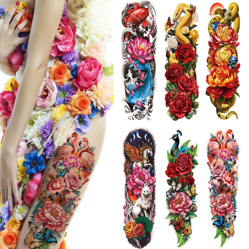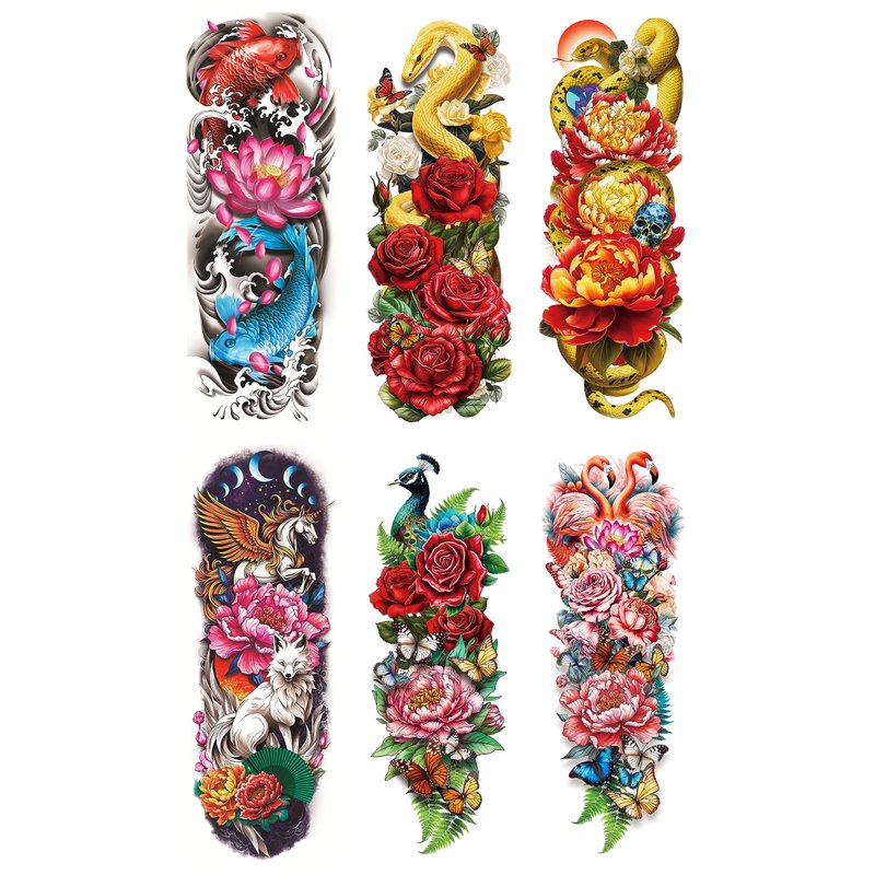 - Vibrant and Realistic Designs ::-- These full arm temporary tattoo sleeves feature six unique, highly detailed designs including floral elements like roses and peonies, alongside bold images of snakes, butterflies, and koi fish. The vibrant colors and intricate patterns give these fake tattoos sleeves a lifelike appearance, perfect for adding a touch of style to any outfit or costume for Halloween, festivals, or themed parties.