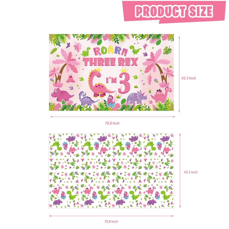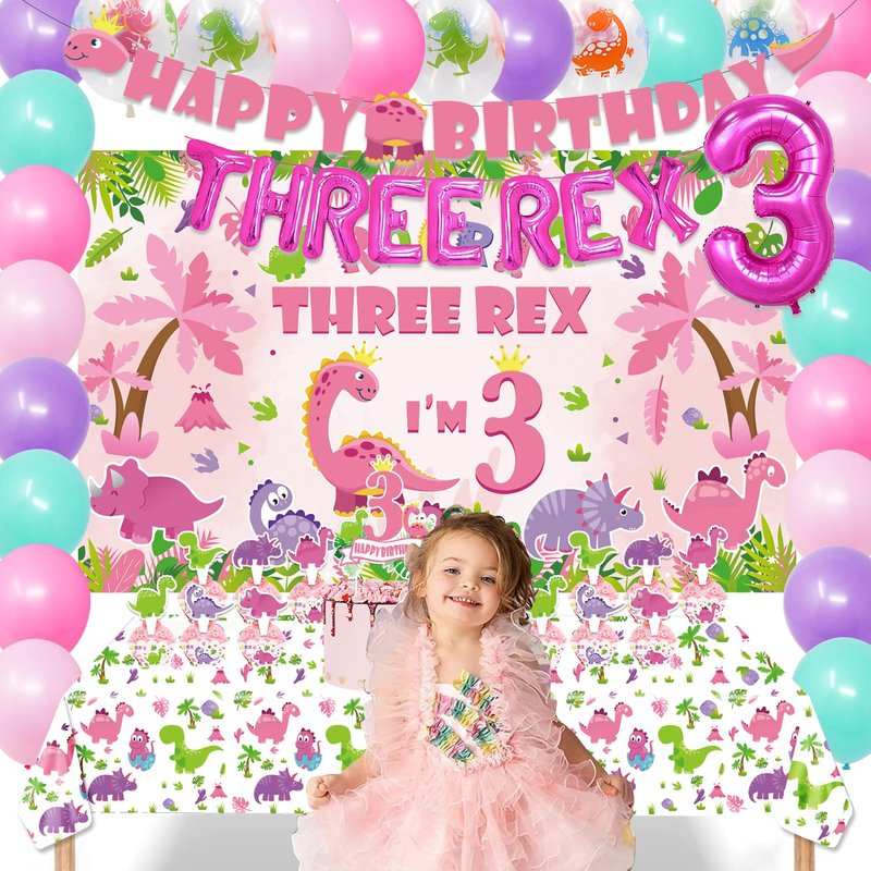 KOTLMIGHT Dinosaur Birthday Party Supplies for 3 Year Old Girl, Three Dino Rex Pink Dinosaur Party Decorations for Girls Baby - Backdrop, Banner, Toppers, Cupcakes Wrappers, Balloons and Tablecloth