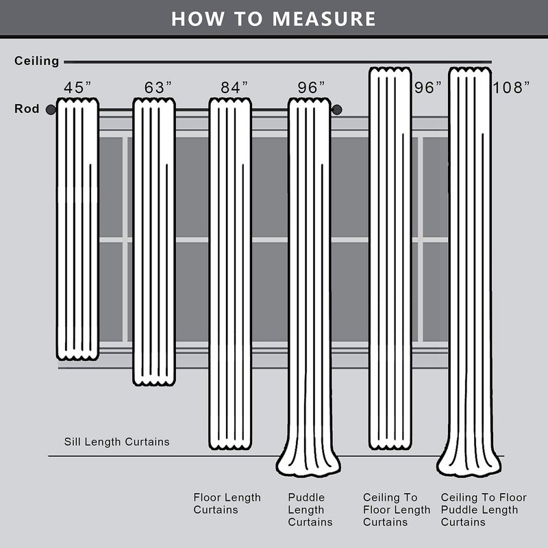 - READY MADE: Sold per pair (set), including 2 window panels - Each panel measures: 52 inch width by 63 inch length. Finished with 1.5 inches header and 3 inches rod pocket.
