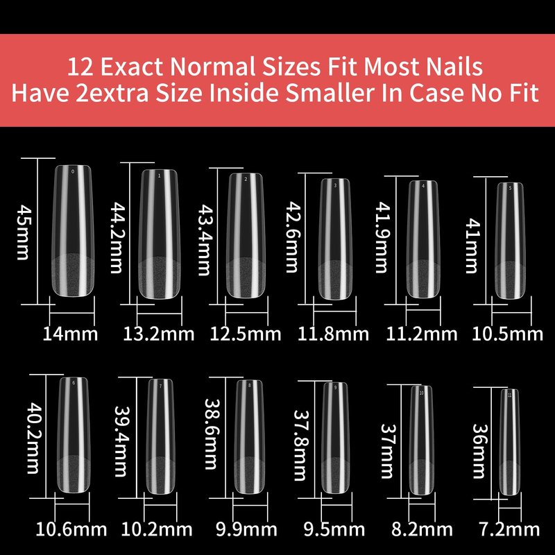 - 12 Size Options: There are 12 different sizes for you to choose from, each size is pre-numbered 0-11, all placed in a storage box, convenient for you to choose the right size. The semi-covered full cover nail tips are non-marking and smooth, easy to color, and will not damage your original nails.
