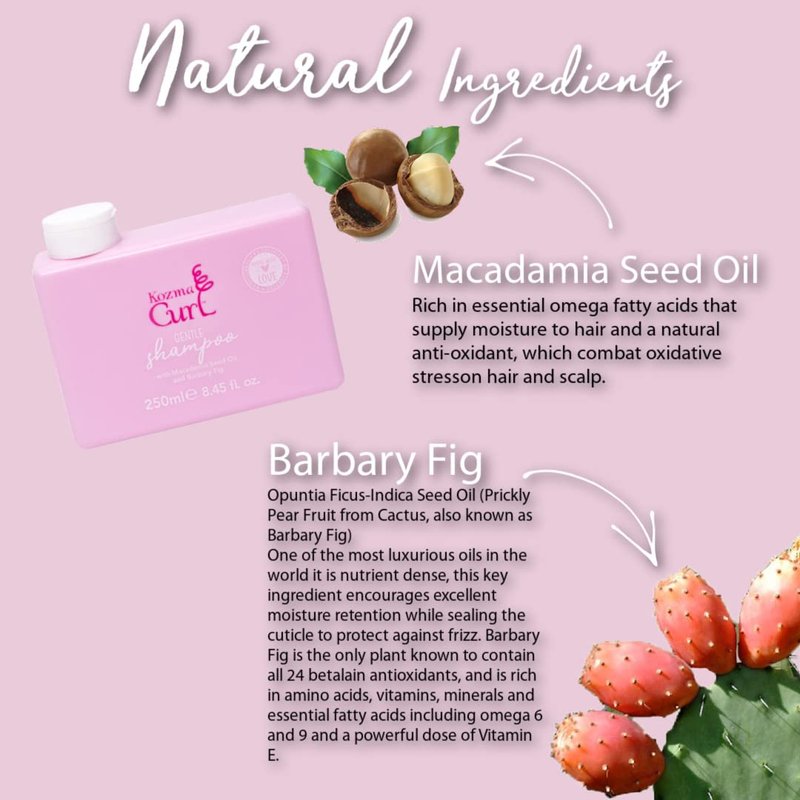 Kozma Curl Gentle Shampoo 250ml is for wash days when shampoo is essential, our gentle formula produces a mild lather and does not contain any of the harsh ingredients that strip away moisture and natural oil. About Kozma Curl brand: Kozma Curl products are made with love NO SILICONES NO SULFATES PARABEN FREE VEGAN / CRUELTY FREE With high-quality natural key ingredients which nourish and protect the hair, there is plenty to love about Kozma Curl Products. Barbary fig (cactus fruit), macadamia seed oil, coconut oil, aloe leaf, & soy protein are just some of the ingredients that make them gentle yet effective resulting in frizz-free, healthy, hydrated and defined curls. Kozma Curl products are designed to be easy and simple to use so that anyone, with any curl type can realize the full potential of their natural hair texture. We offer curl care and curl styling solutions through the form of hair products (cleansers, moisturizers, treatments and stylers) and tools (such as clips, towels, and diffusers) to help you embrace and love your curls.