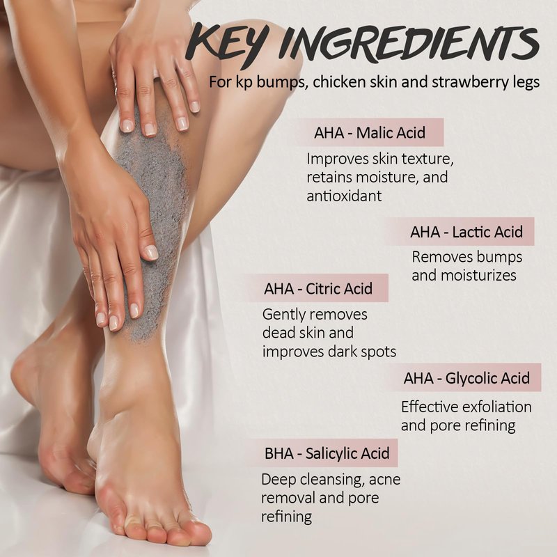 - Targeted For KP Bumps: Are you still worried about chicken skin, strawberry legs and other skin bumps? Try our Exfoliating Body Scrub! It combines the dual benefits of physical and chemical exfoliation to gently and effectively remove dead skin, stimulate skin metabolism, improve the overall appearance of your skin, and make you look and feel more confident.