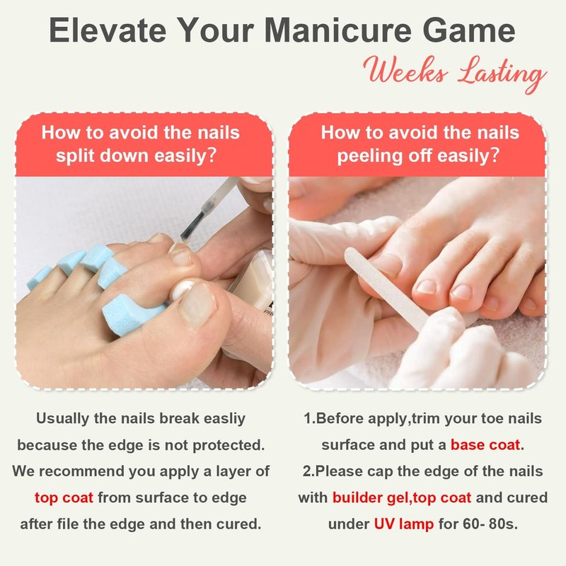 - 💦【Superior Service】Our brand has been aimed to provide high-quality short press on nails for toes for women and girls for many years.If there are any defects or issues with the product,feel free contact us.