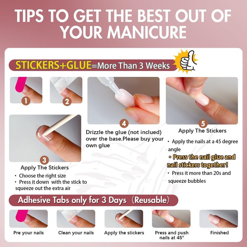 2.Please note that the nail glue is not included.If you want it last for a longer time,please use nail glue instead of the nail stickers.