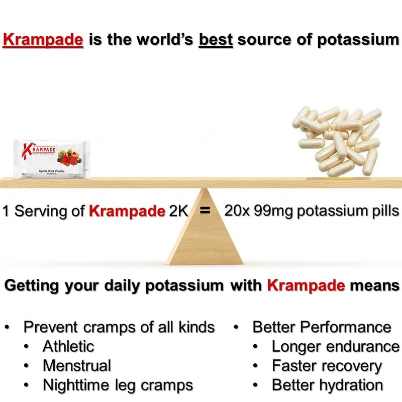 Imagine a world where the fear of a painful cramp is virtually unknown and where your sports drink makes a real, tangible difference you can feel instantly to energize your body. That world exists today with Krampade 2K 2.0. Krampade 2K 2.0 contains 2000 mg potassium synergized with 50 mg magnesium per serving and is designed to replace your current sports drink, potassium, and magnesium supplement. Krampade 2.0 magnesium/potassium is the optimal ratio for these electrolytes for effect and ease on the gut. This is the go-to product for most people to optimize their electrolyte balance and prevent cramps. It prevents cramps, improves hydration, increases endurance, and speeds your recovery. All cramps have the same physiology. Not enough potassium is left in the muscle to repolarize the cell and the muscle is left in the contracted state and cannot be controlled, aka a cramp. Krampade 2K 2.0 works to help prevent: Athletic cramps, Nighttime leg cramps, Heat cramps, Charlie horses, and Menstrual cramps. The high potassium and chloride improve hydration significantly. Insatiable thirst is simply due to not having enough potassium. During WW2, British soldiers stationed in Iraq drank lots of water and were still thirsty. The British Army determined that the problem was these men didn’t have enough potassium. Krampade is used by elite athletes all over the world. Krampade has radically improved their athletic performance. Players have reported up to a 70% reduction in measured water loss after they switched from a typical sports drink to Krampade. They also report much faster recovery, even during their games. What an edge to have over the competition, being physically and mentally fresher simply by having the ideal electrolyte mix of potassium, magnesium, and sodium of Krampade 2K 2.0 in your bottle.