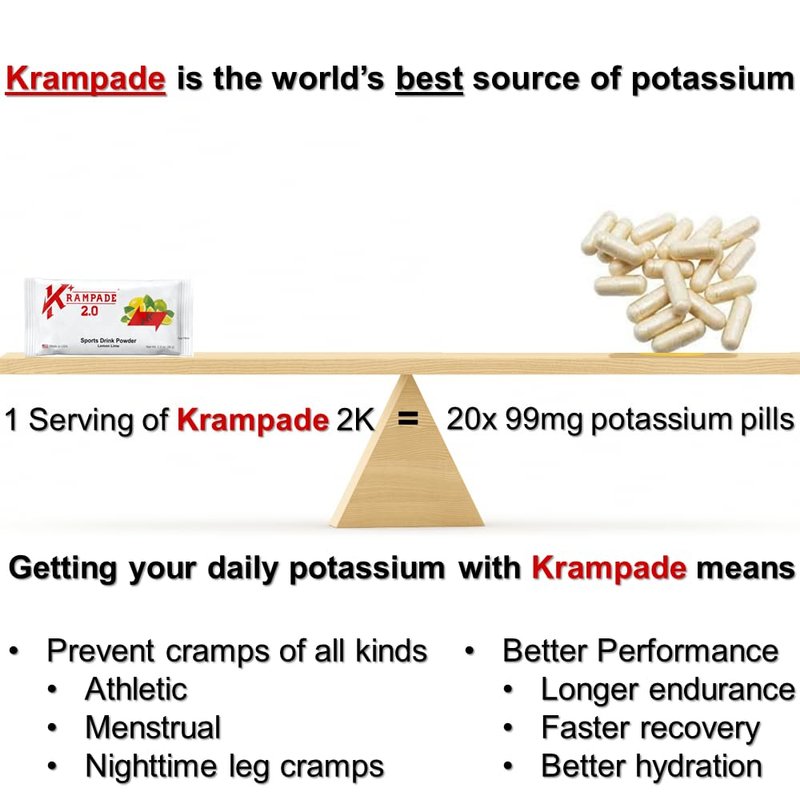 - Complete Cramp Defense - Krampade's proprietary potassium chloride and potassium citrate powder is the faster, more effective alternative to quinine for leg cramps, heating pad for period cramps, and other so-called solutions. If it cramps, we uncramp it, guaranteed.