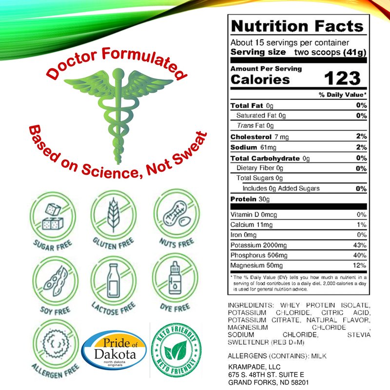 Krampade Whey Protein Electrolytes Powder | 30g Protein & 7g BCAA + 2,000mg Potassium Supplement + Magnesium | >2X More K+ Than Coconut Water