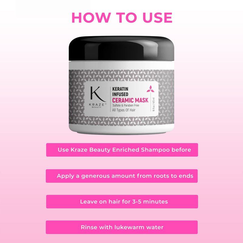 Directions for use: After Shampooing with Kraze Beauty Enriched Shampoo, apply a generous amount of product and work through the hair from the roots to ends. Leave 3-5 minutes for your hair to fully absorb the keratin and the rinse with lukewarm water.