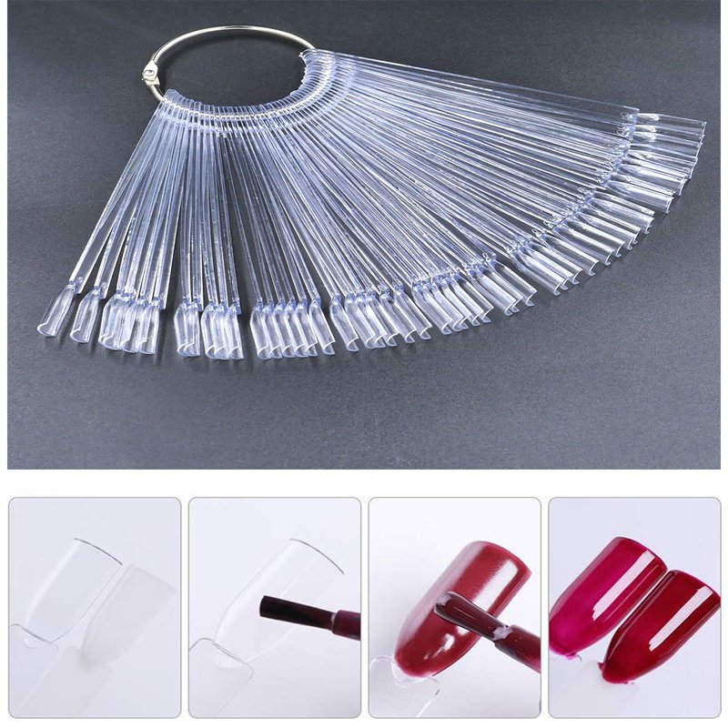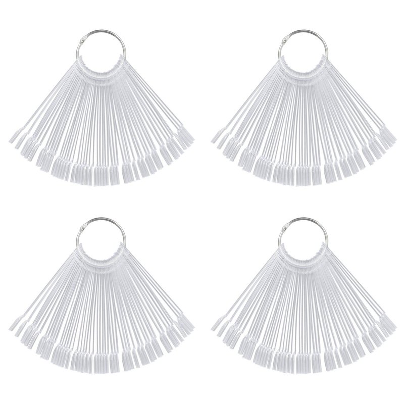 KRISMYA Set of 4 Total 200 Pcs Clear Nail Swatches Sticks,Clear Nails Sample Sticks,Transparent Fan-shaped Nail Art Tips Display Polish Board Display Practice Sticks Tool with Metal Split Ring Holder