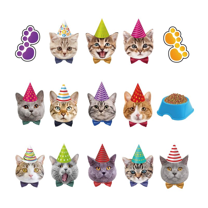 - Include: 16 different double-printed cutouts (Cat Face) and 14 assorted colors of red, yellow and bgreen foil whirls decoration, extend to 37’’ long. Each decoration is made from 350 gsm cardstock and PVC plastic.