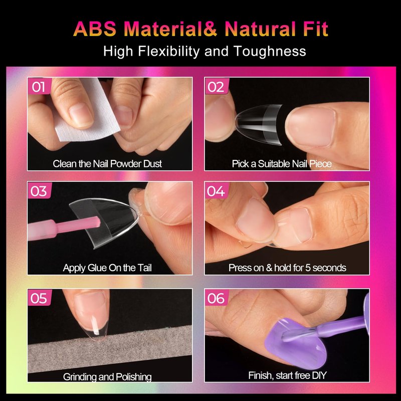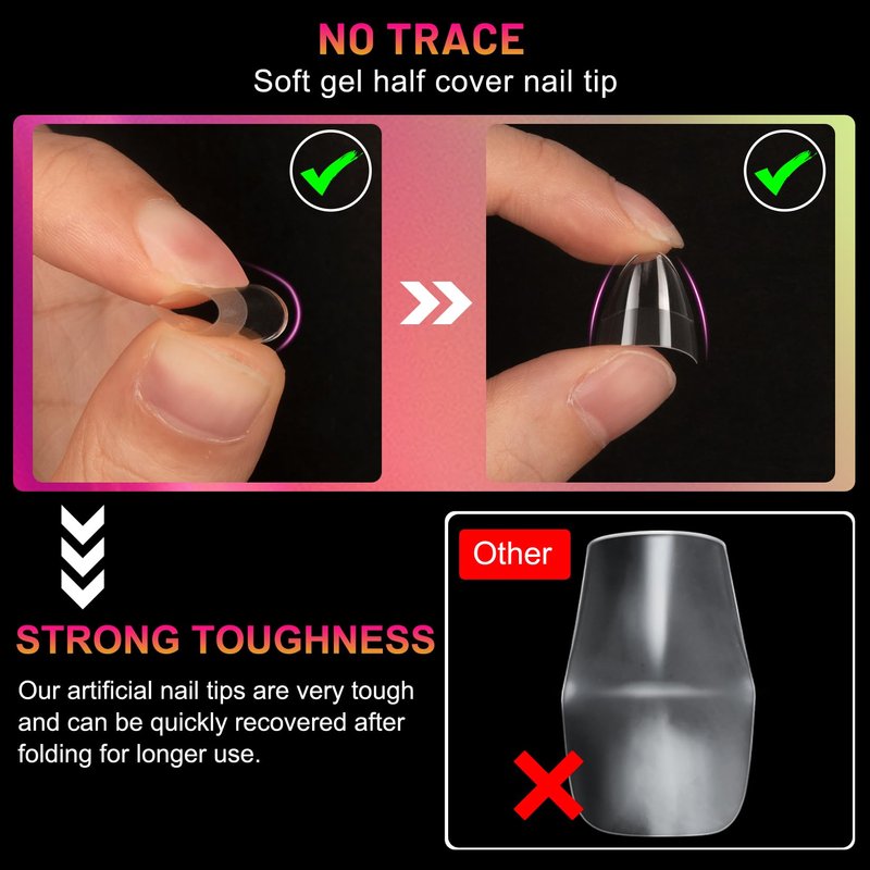 - DESIGN FEATURES OF SOFT GEL NAIL TIPS: Almond nail tips are made of soft gel materials that is flexible. These traceless short almond press on nails are flexible, don't break easily and allow the color to be applied more evenly, so you can easily make the manicure you want. You can pair half cover short fake nails with gel nail polish, colored gels, and dipping powders to add a little color to your life