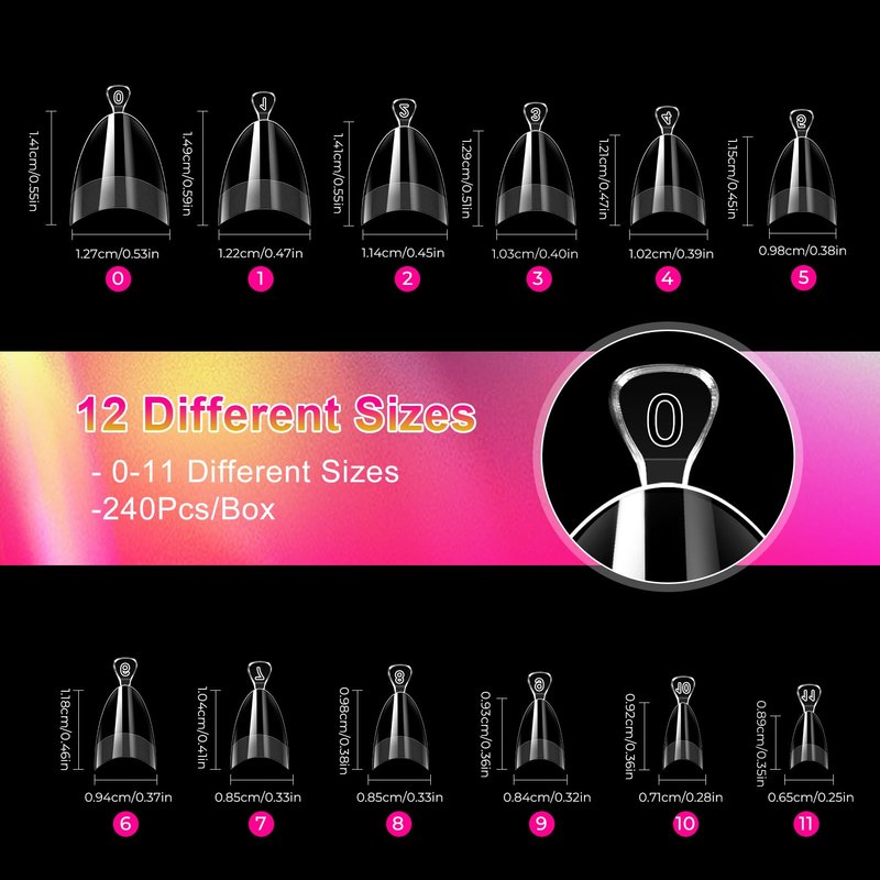 - 12 SIZES NAILS TIPS FOR PERFECT FIT: Our almond shape nail tips come in 12 different sizes, totaling 240 pieces, providing you with a wide variety of options. Our half cover nail tips are easy to apply, making them suitable for both professional manicurists and nail beginners. With a storage box, you can easily store extra short almond nail tips of different sizes. The whole box is portable, making it a great choice for daily and travel use