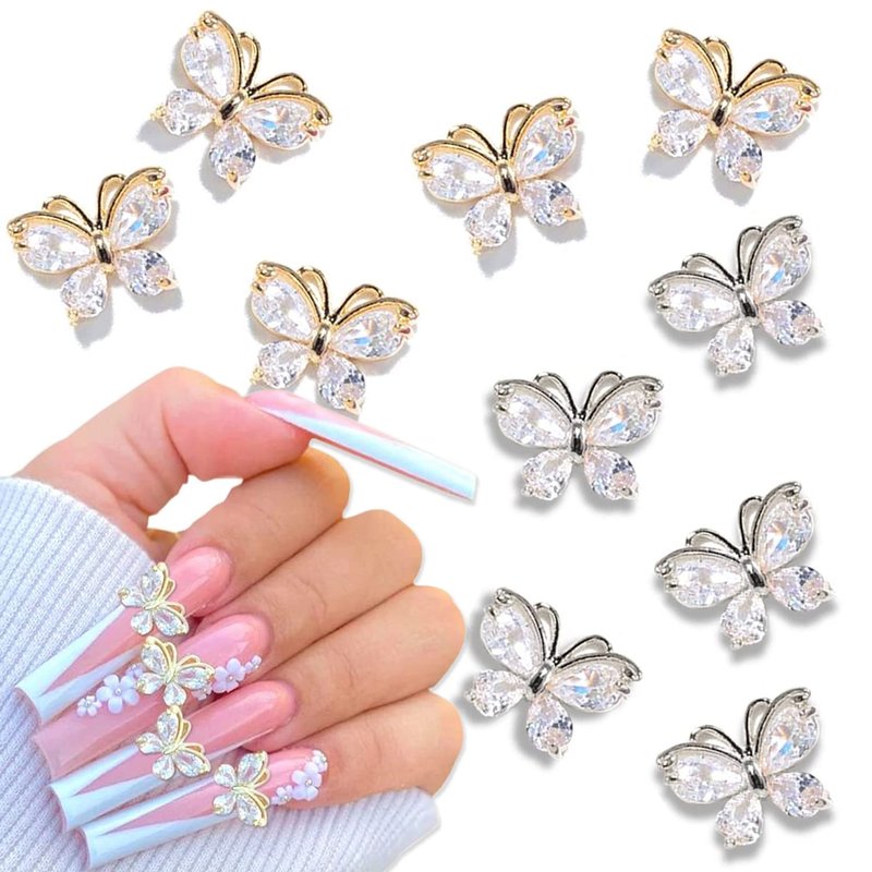 KRTBKR 10Pcs Alloy Butterfly Nail Charms Gems Rhinestones 3D Metallic Gold Silver Charm Decorations Art Supplies for Women Girls Acrylic Manicure Jewelry