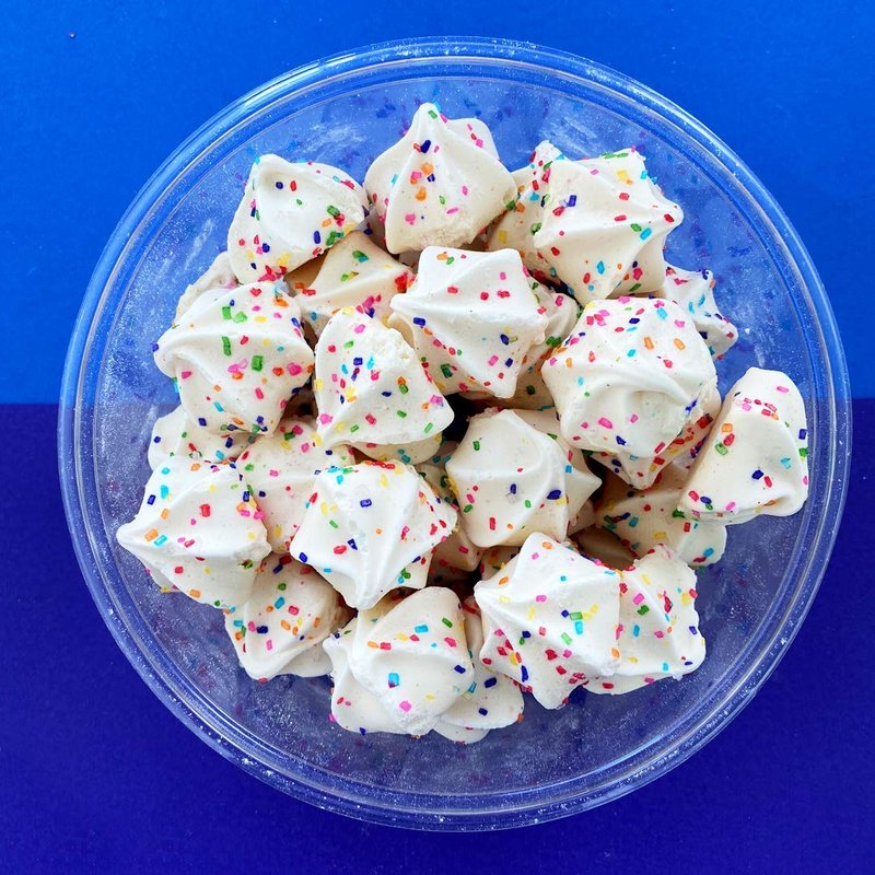 Original Meringue Cookies!! Birthday Cake Flavor. Meringues are the perfect all day snack. Our great quality is not a secret, just the final product of a very controlled manufacturing process using only premium ingredients. These original meringue cookies are fat free, nut free and gluten free. Only 90 calories per serving. Low calorie snacks for every occasion. Kosher Pareve. Each tub contains 4 ounces.