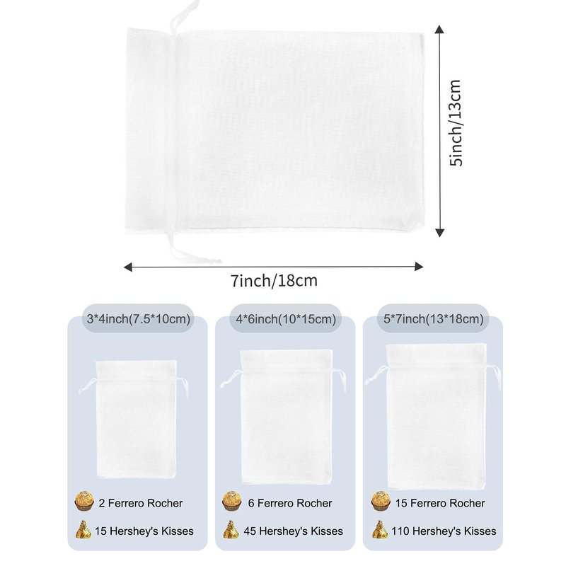 - 100Pcs White Organza Gift Bags: Made with premium sheer organza material,which is very durable,they fasten with a drawstring.size approx 3x4inch (7.5x10cm).