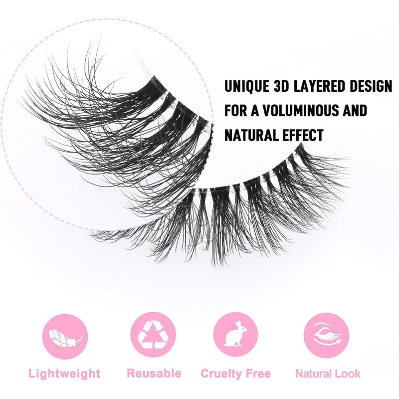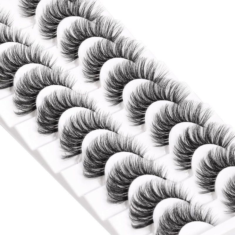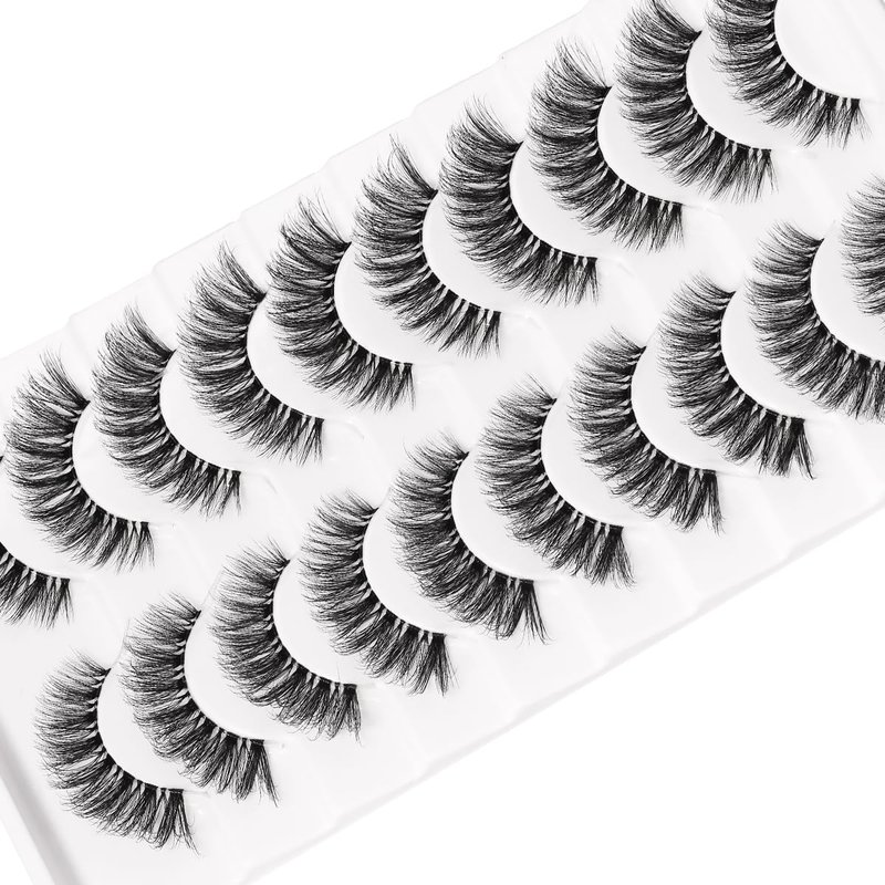 KSYOO 10 Pairs D Curl 8-15mm Cat Eye Lashes, Clear Band 3D Fluffy Wispy Faux Mink Lashes That Look Like Extensions,Semi-dramatic Russian Strip Eyelashes Pack-10 Pairs (Clear Band V1-10 Pair)