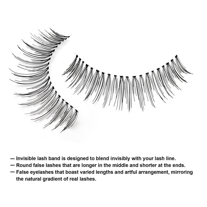 These natural-looking false eyelashes add subtle yet noticeable length and volume to lashes. Featuring a lightweight and flexible faux lashes material, the lashes mimic the look and feel of real eyelashes for a seamless enhancement. The thin lash band is designed to blend invisibly with your lash line so these lashes appear as a natural extension of your own. Ideal for beginners or those seeking a discreet yet defined lift, these lashes are comfortable enough to wear all day without any irritation or awareness that they are not your real lashes.